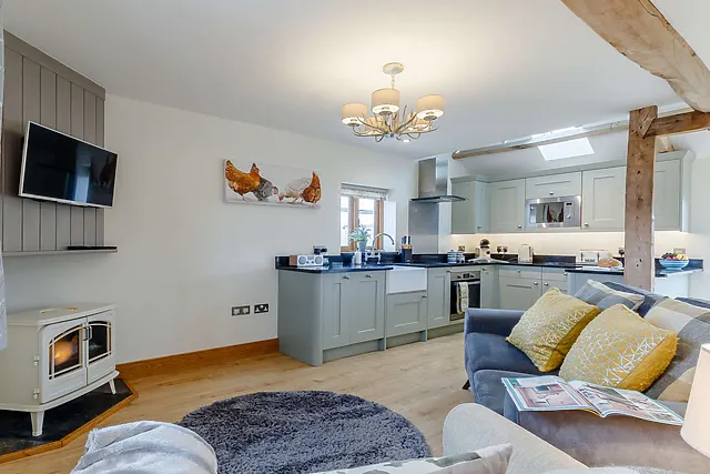 The open-plan living space is stylish and contemporary, complete with a well-equipped kitchen, a comfortable lounge area with a wood burner effect electric fire, and a smart TV for your entertainment.