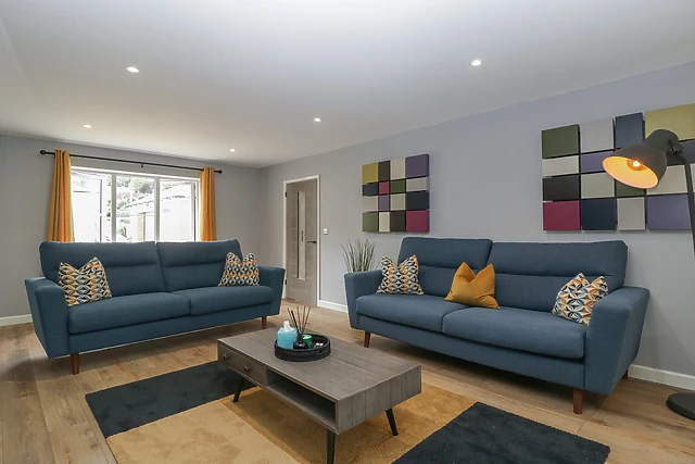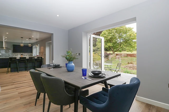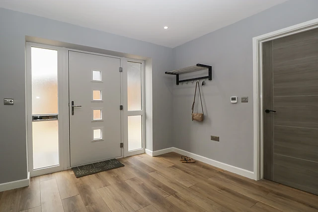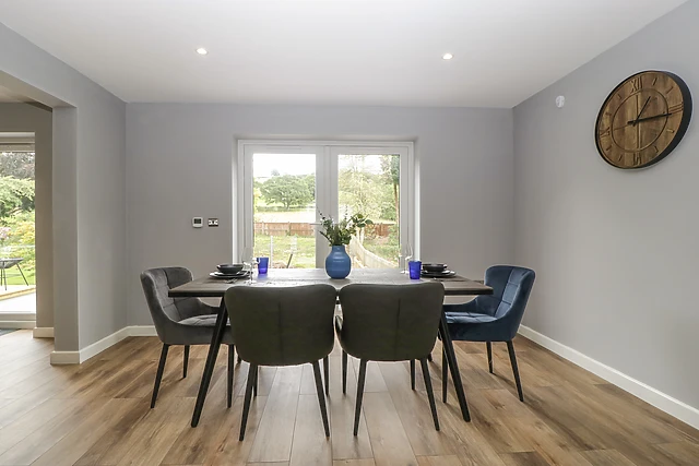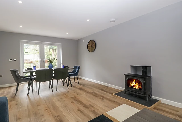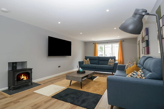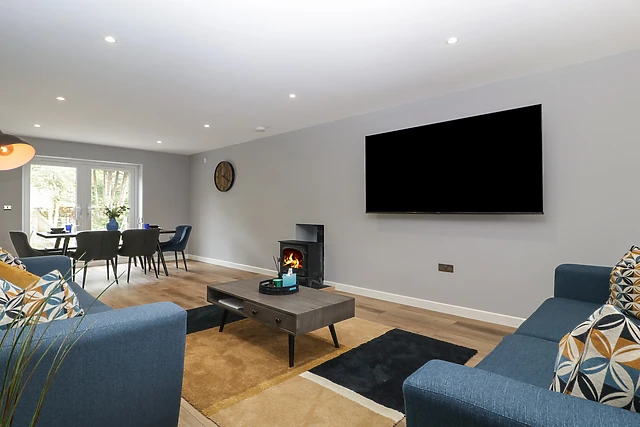 Park up on the driveway outside Ranbir House, taking a moment to breathe in your peaceful new setting. Step into the home to discover a collection of immaculate, well-appointed interiors, including an elegant, open-plan living space housing a fully-equipped kitchen with breakfast bar and integrated appliances, a dining area with seating for the whole group, and an inviting sitting space with two plush sofas, a wall-mounted Smart TV, and a tasteful woodburning stove.