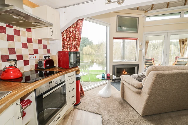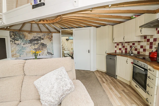 Providing ground floor accommodation with a cosy mezzanine bedroom overlooking the living area, this charming holiday home has been thoughtfully built. The property is furnished to a high standard, including a fitted kitchen, sauna, projector and screen and a king-size bed from where films can be enjoyed.