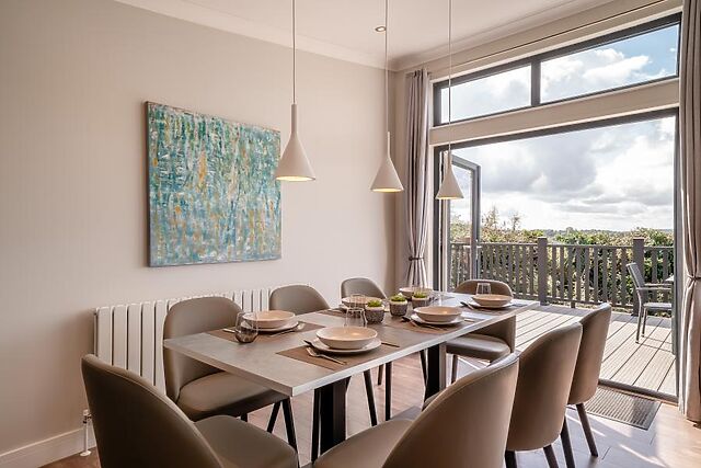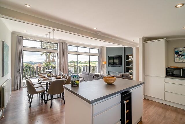 Our lodges offer the ultimate luxury getaway, from couples retreats to a full family holiday. Surrounding area • Biking, hiking, kayaking and climbing are just a few of the activities available on your doorstep • The River Wye is only 3 miles away, perfect for water-based adventures • Forest of Dean walking trails are just a 10-minute walk from your lodge • Forest Hills Golf Club offers an 18-hole parkland course overlooking your accommodation Living space • Spacious open-plan living area with high-spec kitchen featuring island breakfast bar • Dining table perfect for family meals and entertaining • Contemporary lounge with stylish media wall offering live television and streaming services • Double patio doors flooding the space with natural light Bedrooms and bathrooms • Master bedroom suite with large king-sized bed, walk-in wardrobe and ensuite facilities • Second double bedroom with ensuite facilities and patio doors to decking • Additional double and twin bedrooms for larger families and groups • Family bathroom incorporating bath with integral shower Outdoor space and on-site facilities • Enclosed garden area providing seclusion and privacy • Double patio doors from bedrooms leading directly onto outdoor decking • 1200 square feet of internal space perfect for larger families and groups Highlights and notable features • Four-bedroom accommodation sleeping larger groups comfortably • Master suite with direct access to hot tub area - perfect for morning dips • Contemporary furnishings throughout with attention to luxury detail • Peaceful surroundings overlooking established parkland golf course This superb lodge offers the perfect retreat for families and groups seeking luxury accommodation with easy access to Forest of Dean adventures and the tranquil beauty of Gloucestershire countryside.