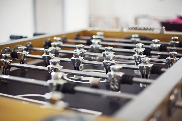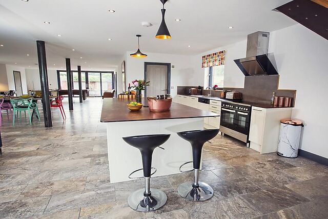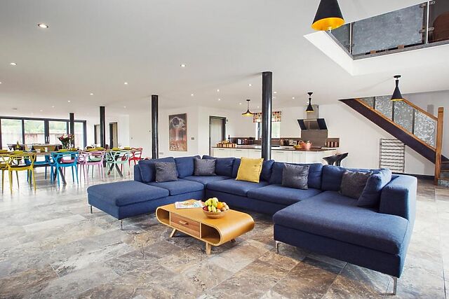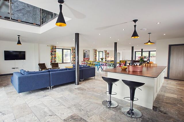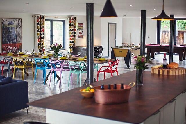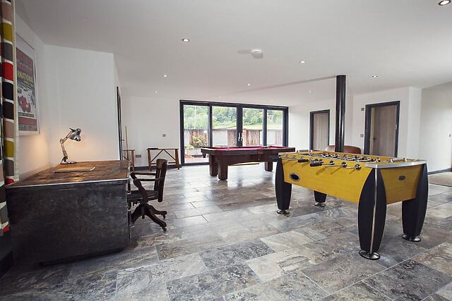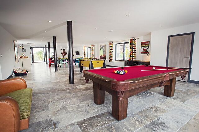 The open-plan living space is ideal for socialising, featuring a well-equipped kitchen, a cosy lounge area with a TV and sound bar, and a games area with a pool table and table football.