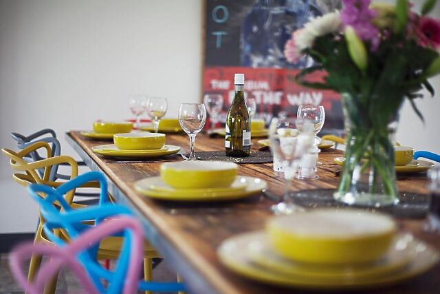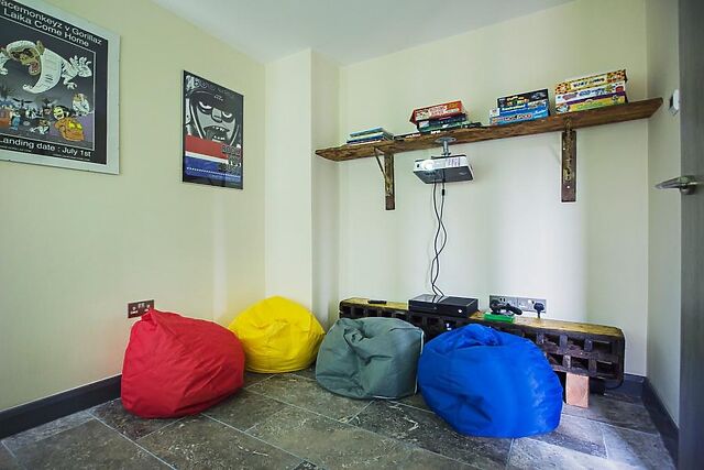 Guests can enjoy a variety of entertainment options, including a games room with a pool table and table football, a projector room for movie nights, and a lounge area with a TV and sound bar.