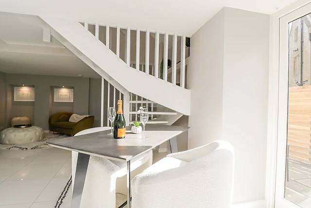 Guests can take pleasure in the enclosed shared gardens, complete with lawn and furniture, offering a serene outdoor space to relax and dine alfresco.