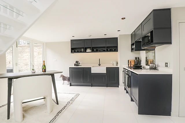 The bi-fold doors flood the room with light, offering views of the tranquil surroundings. The kitchen is well-equipped, ensuring you have everything you need for a comfortable stay.