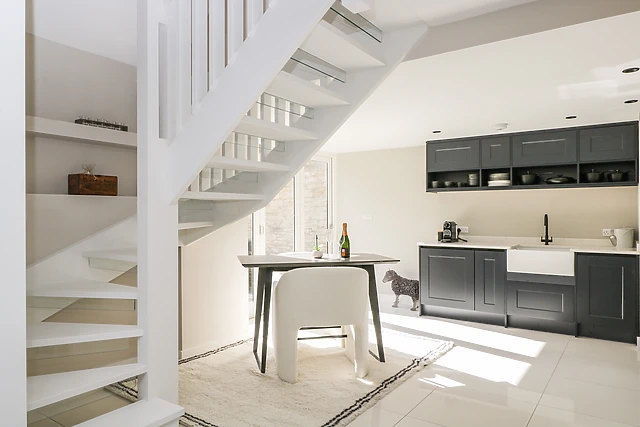 Relax in the open-plan living space, where a woodburning stove adds a cosy touch to your evenings.