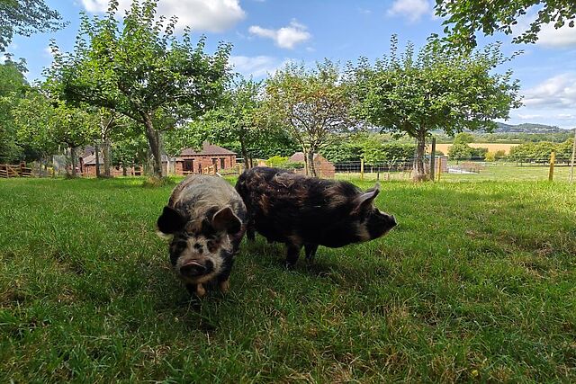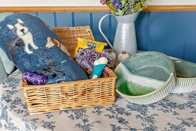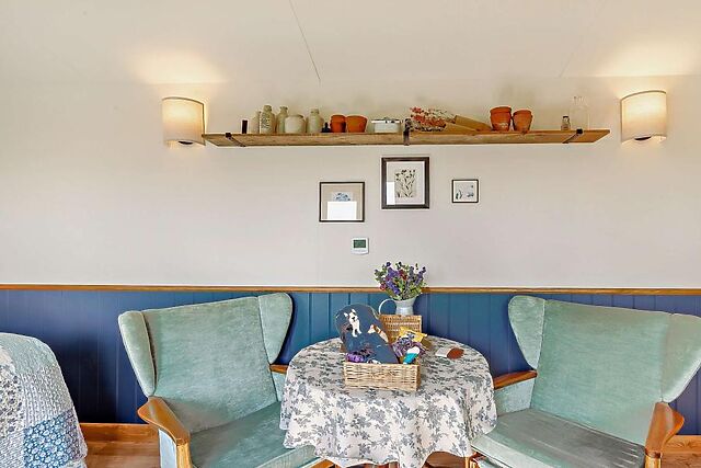 The kitchen, finished with colourful crockery, offers everything that you may need for self-catered meals, along with a table and chairs for two where you can enjoy a simple supper with countryside views. A seating area with comfortable armchairs provides space to relax in the evening with the added benefit of underfloor heating.