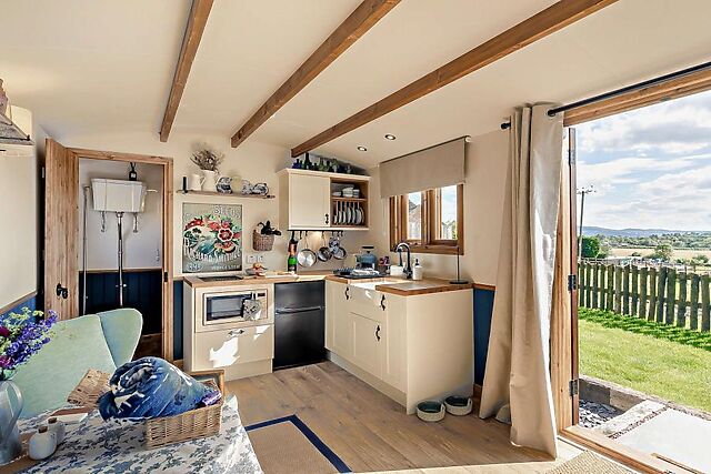 This shepherds’ hut has been thoughtfully positioned to make the most of the views, enabling you to relax, unwind and recharge, leaving the world behind. Inside, the thoughtful design incorporates touches of luxury to enhance your stay.