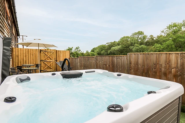 Indulge in the ultimate relaxation with a private hot tub, set within a picturesque garden and patio area.