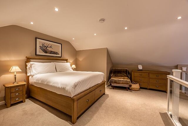 A staircase within the living area leads to a spacious king-size bedroom on the upper level, complete with an elegant glass balcony overlooking the ground floor. The ground floor also features a gleaming shower room with a rainfall shower.