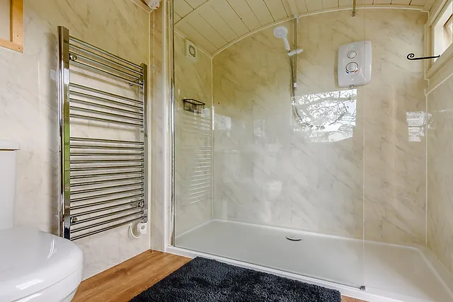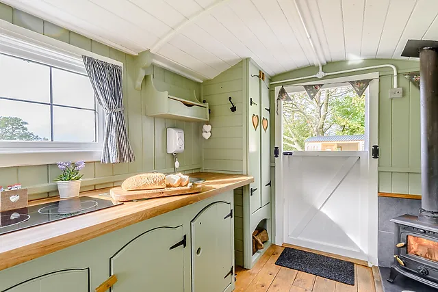 Inside, you'll find a snug double bed, a wood-burning stove for chilly evenings, and a well-equipped kitchen area. The separate hut provides a spacious shower room, ensuring your stay is as comfortable as it is memorable.