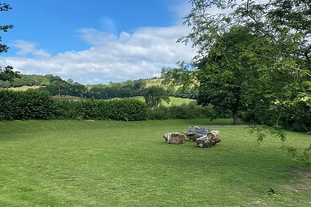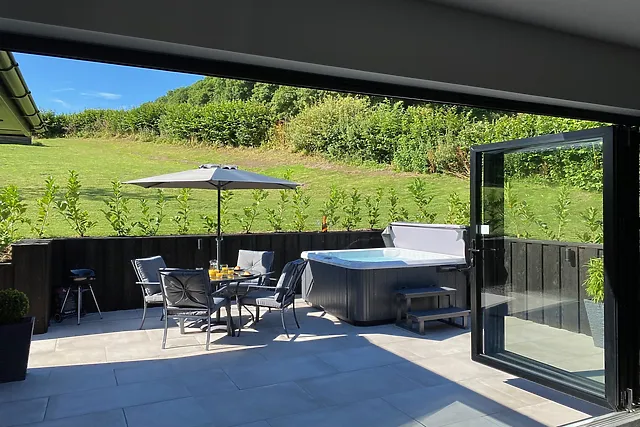 Outdoor space and on-site facilities - Private terrace with a hot tub and countryside views, perfect for unwinding in the fresh air. - Front lawn area with a picnic bench for outdoor dining or relaxing moments.
