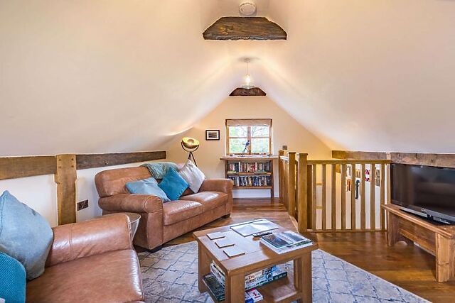 The accommodation spans two floors, featuring an oak-beamed, open-plan living space with cosy electric fire and panoramic views.