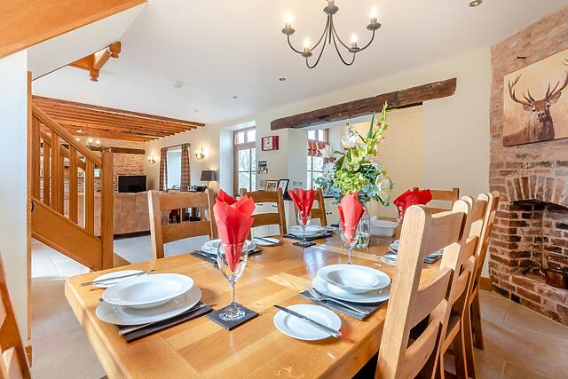 Stepping inside this beautifully reimagined barn, you will be greeted by the elegantly furnished open-plan lounge/kitchen/diner with exposed stonework, oak beams and limestone flooring. The cosy and traditional lounge has a Smart TV and comfortable seating, perfect for unwinding in after a day’s adventures.
