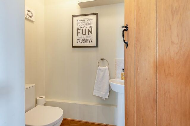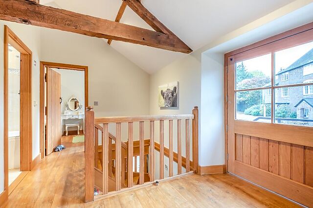 This room has an en-suite wet room, and the property has an additional ground-floor WC. Heading up the oak staircase, the galleried landing on the first floor leads to three further bedrooms, all with original wooden beams.
