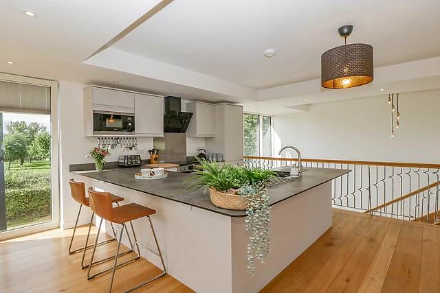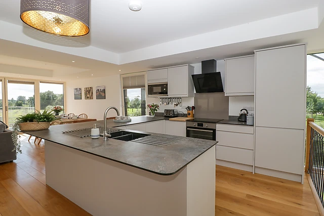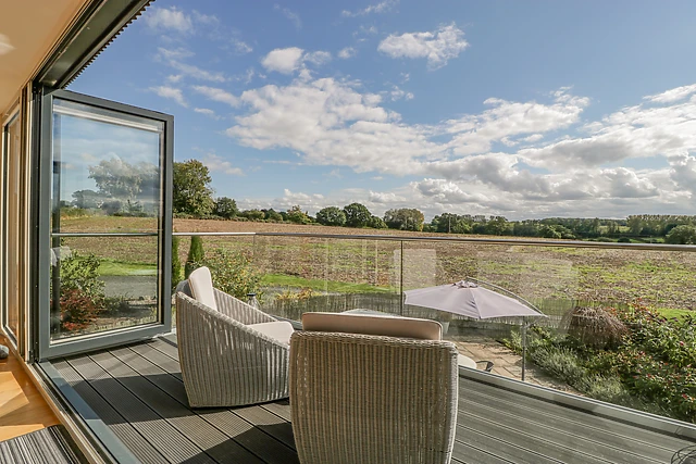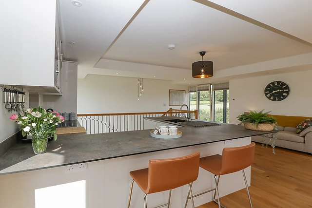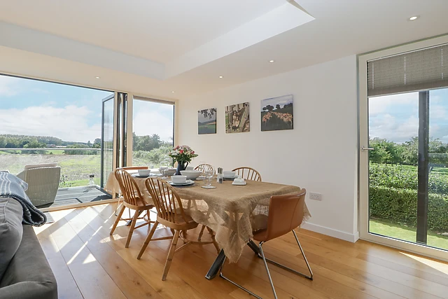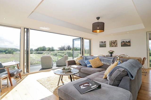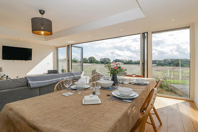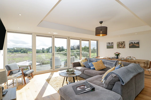 You can relax on the sofa in front of the wall-mounted TV or simply take in the beautiful views of the surrounding farmland and green countryside. From the top of the stairs, you can see across to the stunning orchard.