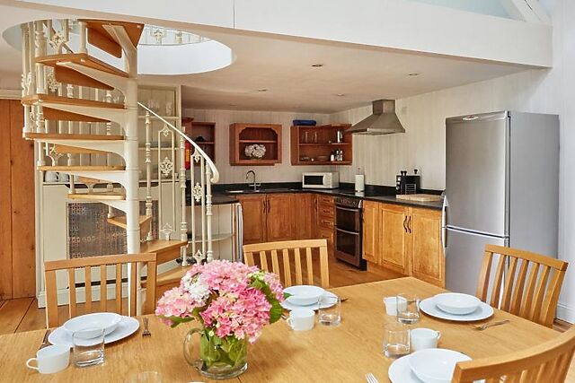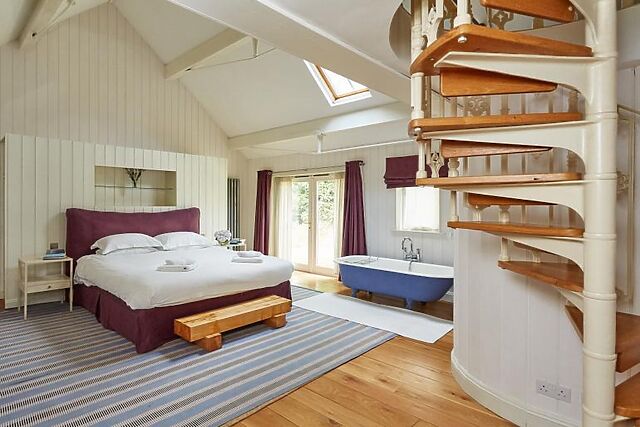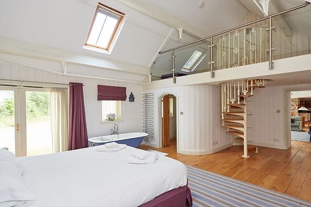 The ground floor also has a lovely super-king-size bedroom with an in-room free-standing bath and en-suite WC. A spiral staircase then leads up to a peaceful mezzanine level making a great spot to curl up with a good book.