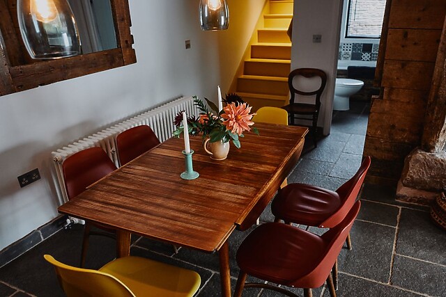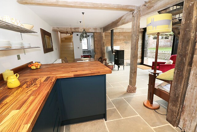 The open-plan living area offers a dining area upon the dark slate tile flooring, where you can gather for the evening meal, or relax at the breakfast bar with a drink, before retiring to the seating in front of the woodburning stove. The cottage has the added benefit of a ground-floor bedroom and two ground-floor bathrooms, while two staircases bring you to the rustic first-floor accommodation featuring exposed beams and original slatted timbers.