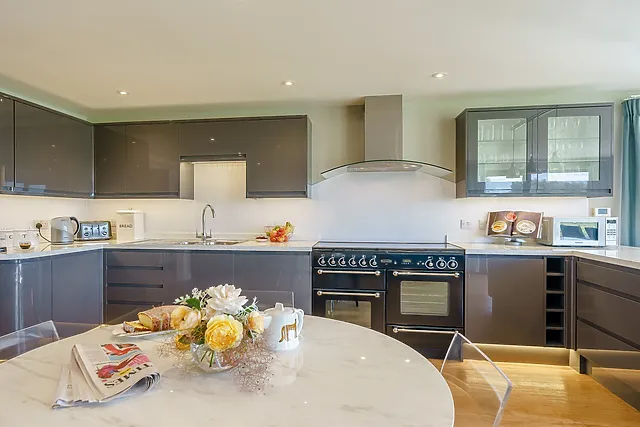 The kitchen is well-equipped for any culinary enthusiast, featuring a gas Rangemaster oven, microwave, American fridge/freezer with an icemaker, dishwasher, Nespresso coffee machine, and a professional juicer.