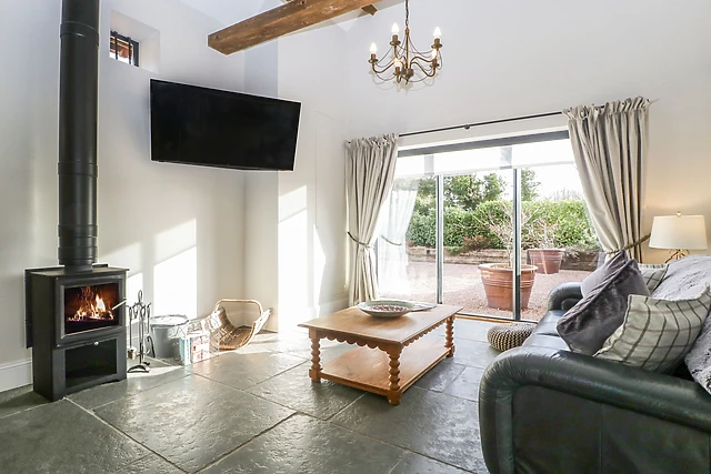 The grey stone flooring has underfloor heating, to keep this space homely and warm, alongside the woodburning stove, which comes with a small supply of logs, kept in the garden. The sitting room area has a large leather sofa and wall-mounted TV, which can be adjusted to face the dining area, so you can enjoy your breakfast whilst watching your favourite Netlfix shows.