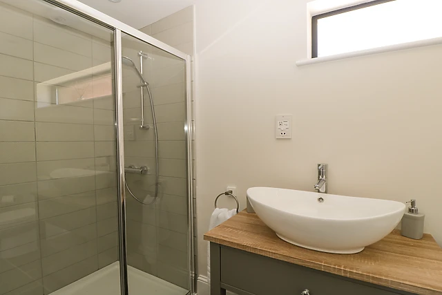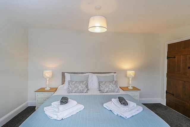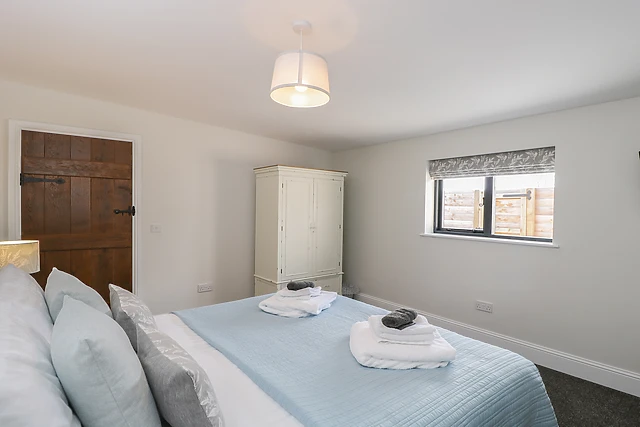 The sitting area also features sliding doors, which open up onto the front of the property and allow in plenty of light while the well-designed kitchen, with beautiful navy blue cabinets, sleek wooden work tops and Belfast sink, is fully-equipped with everything you could need to cook up a romantic evening meal for two during your stay. A small snug area by the front door of the property has a cosy armchair facing the window, where you can relax with a good book or just enjoy looking out onto the estate.