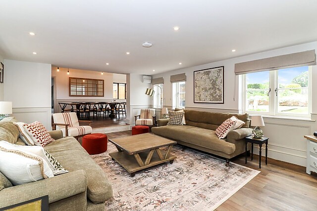 Boasting partial ground-floor living and a toasty woodburning stove, this is the perfect base for families and friends looking to enjoy the countryside while staying close to world-class experiences, Pull up and park the cars outside this neatly bricked abode, where the gravel crunches beneath your tyres in the spacious driveway. Step inside to be greeted by an outstanding, harmoniously designed living area that seamlessly combines a sleek kitchen, dining space, and inviting sitting area.
