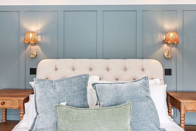 When it’s time to retire for the night, you’ll find three beautifully presented bedrooms. On the ground floor, a king-size bedroom with a spacious en-suite shower room offers an ideal option for those with limited mobility, Upstairs, discover another king-size room with a charming panelled wall in a calming blue tone, alongside a twin room featuring rustic exposed beams.