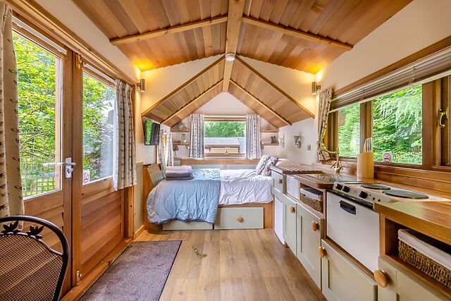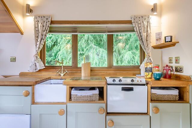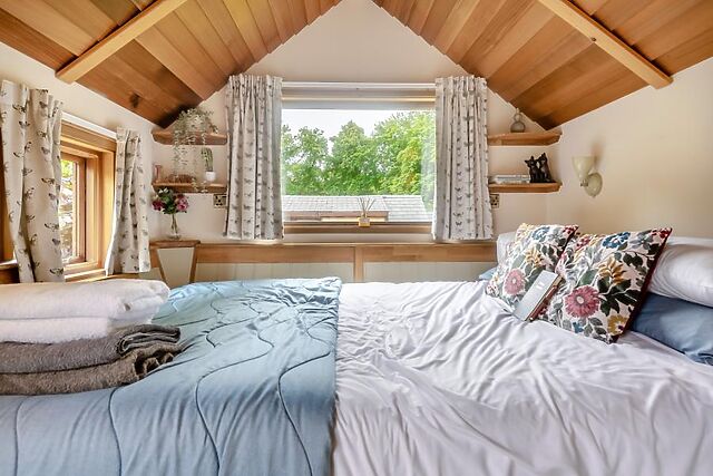 In the morning, prepare a coffee in the kitchen area which has everything you need for making a light snack and an evening meal. On your left is the king-size bed with super comfortable 'Hypnos' mattress, plenty of storage and bedside lamps, the perfect place to relax over your favourite book.