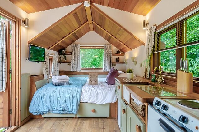 If you prefer a film or series, this cabin has a smart TV at the end of the bed. From here, the views of the countryside and farms can be seen.