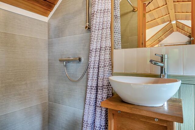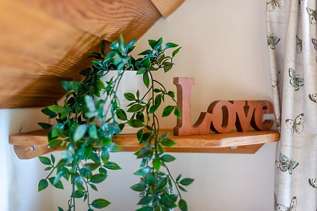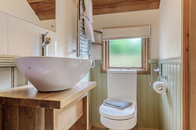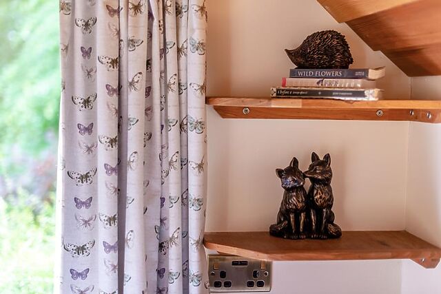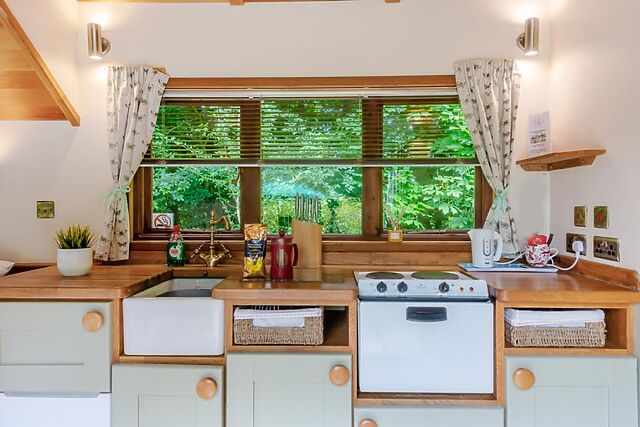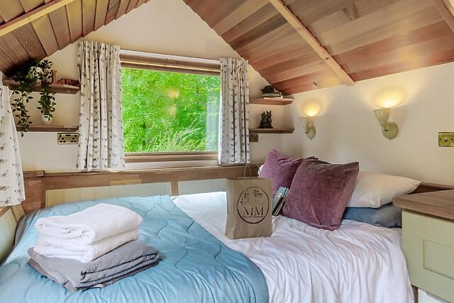 As you walk in, the country style olive green kitchen welcomes you, with everything you need to rustle up and breakfast or a hearty meal. On your left is the king-size bed and plenty of storage, as well as bedside lamps, perfect for relaxing whilst reading your favourite book.