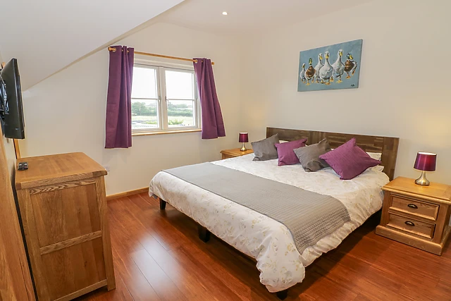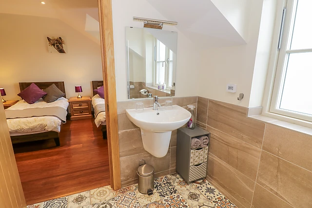 The first is a super-king-size room, complete with a smart TV and an elegant en-suite bathroom, featuring a bath, walk-in shower, basin, and WC. The second bedroom, also a super-king-size, boasts its own en-suite with a walk-in shower, basin, and WC, both bedrooms can be converted into a twin room upon request, ensuring a pleasant stay for all guests.