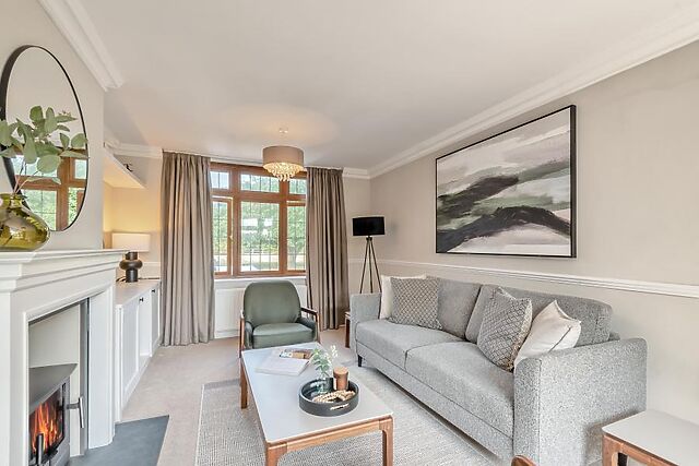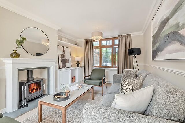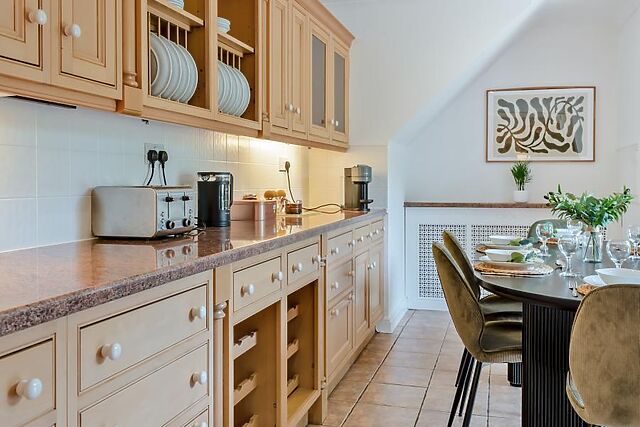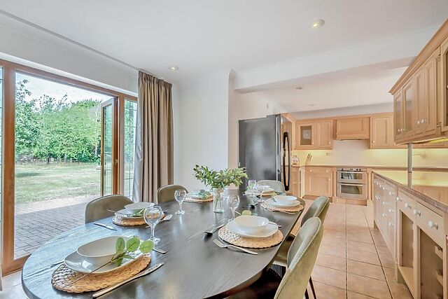 The entrance hall is spacious and welcoming with calming neutral tones and interior-designed accents creating an inviting atmosphere from the get-go as you make your way into the open-plan kitchen/diner. Cook and prep in this ample, muted space, where guests can make use of the vast American-style fridge/freezer and stylish six-seater table by the French doors opening to the garden.