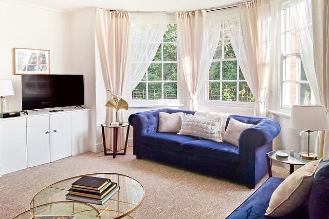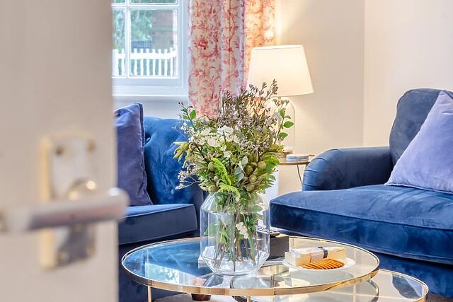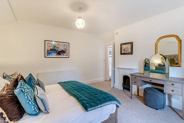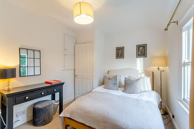 The ground floor also features an elegant shower room with traditional-style fittings. Upstairs, two serene bedrooms, complete with high-quality linens, ornamental fireplaces, and sash windows, promise a restful night’s sleep.