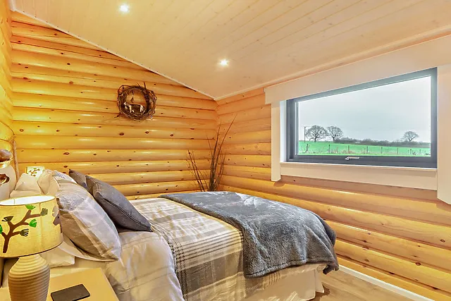 The cabin harmoniously blends rustic charm with modern amenities, including a fully equipped kitchen and a wood burner for those cooler evenings.