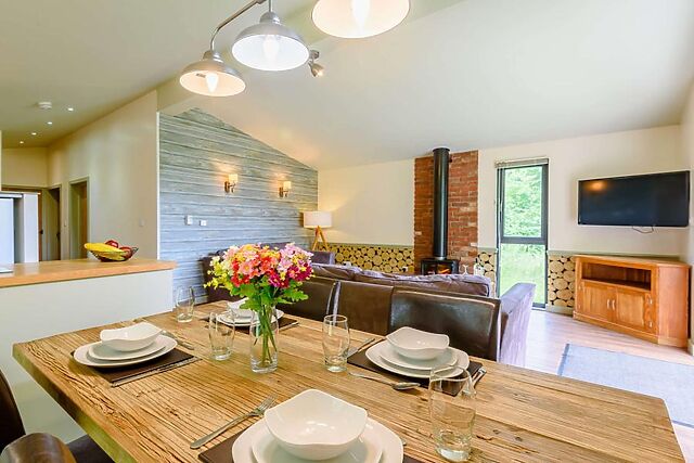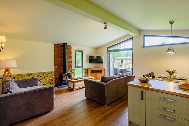 The open-plan living area, with its electric wood burner-effect fire, provides a homely atmosphere for relaxing evenings.