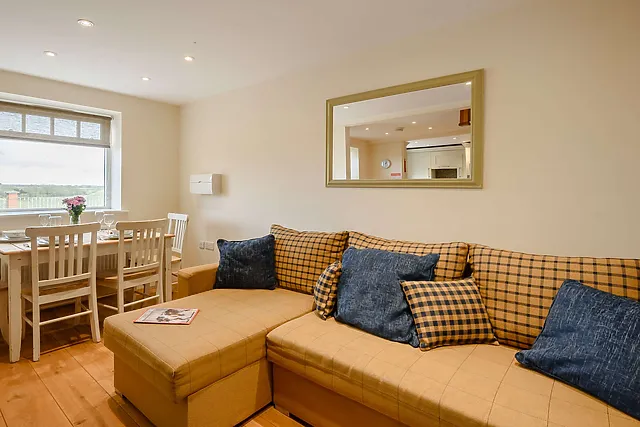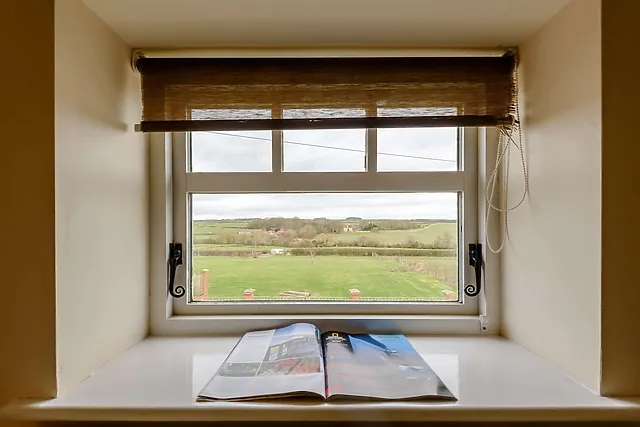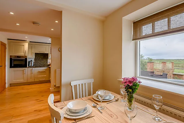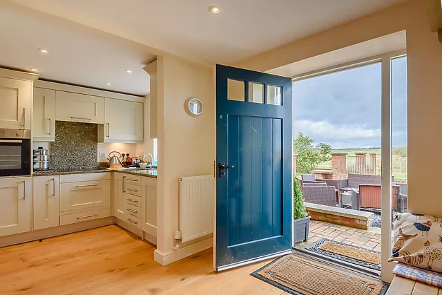 The open-plan living area, complete with a fully equipped kitchen, invites you to unwind and dine with picturesque views of open fields.