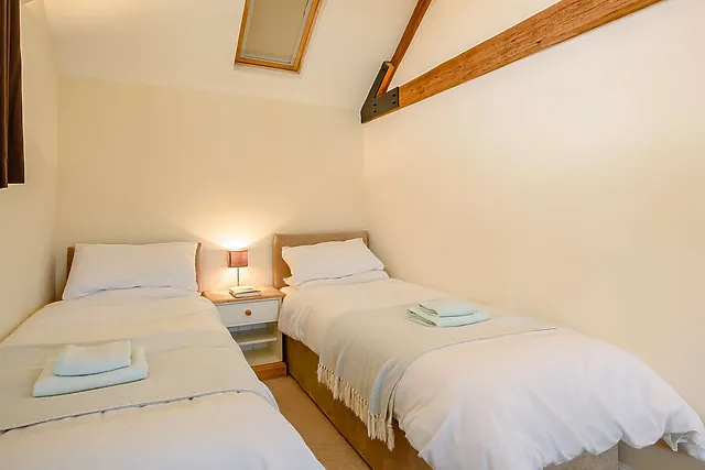 The cottage features two bedrooms, one with a double bed and the other with twin beds, providing comfortable sleeping arrangements for up to four guests.