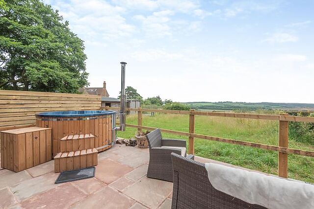 The cottage features a spacious lawn garden with a patio, perfect for dining alfresco or enjoying an evening sundowner. You can also relax in the wood-fired hot tub, which adds a touch of luxury to your stay.