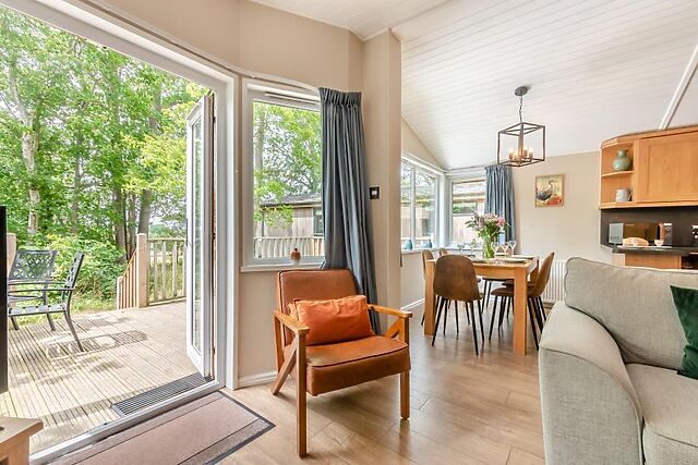 The open-plan lounge, kitchen and dining area features inviting furnishings alongside a dining space perfect for shared meals. With plenty of large windows and French doors, the space is bathed in natural light − open the doors to the decking for indoor/outdoor living on warm days.