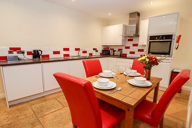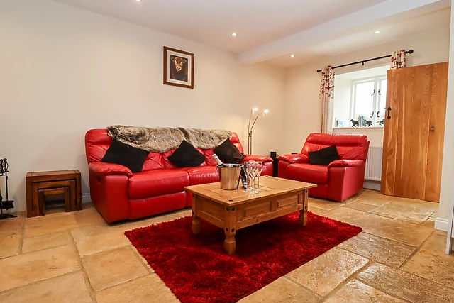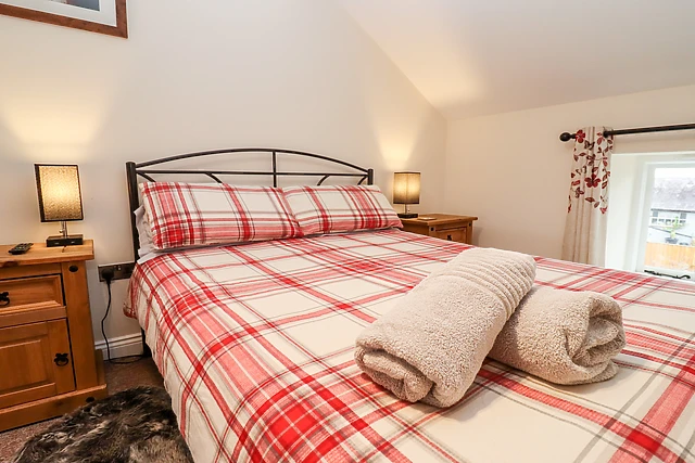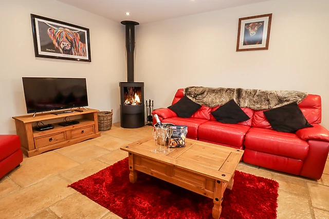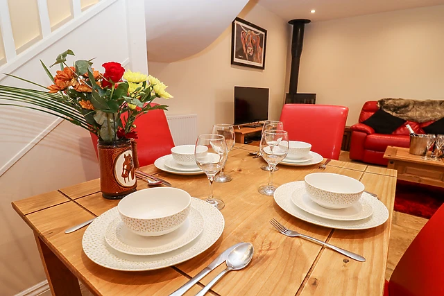 The cottage has an open plan living area with well-equipped kitchen and dining area, with a sitting area having a woodburning stove to snuggle up in front of, if the weather gets colder. Upstairs there are two bedrooms, both of which have a TV and there is also a family shower room.