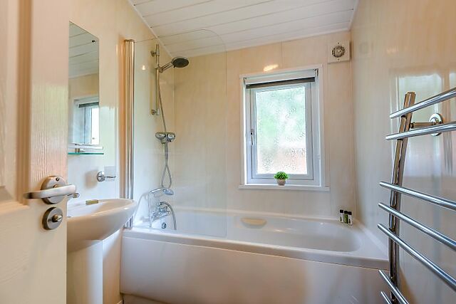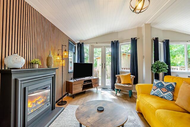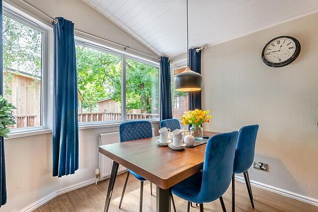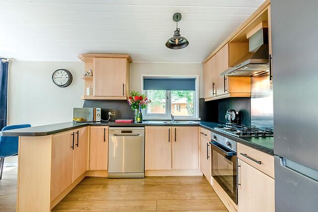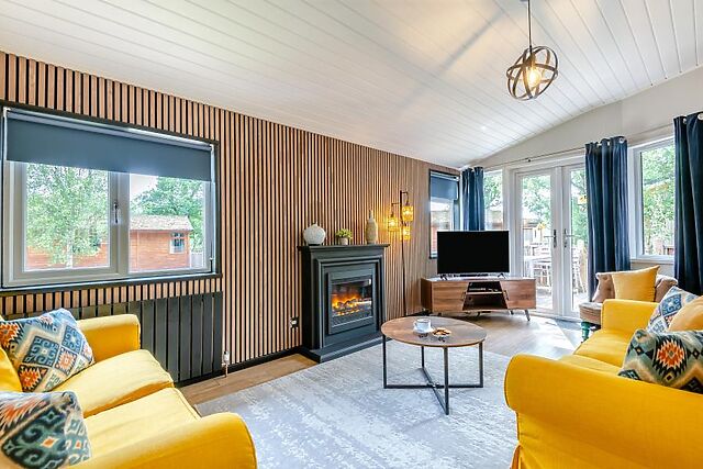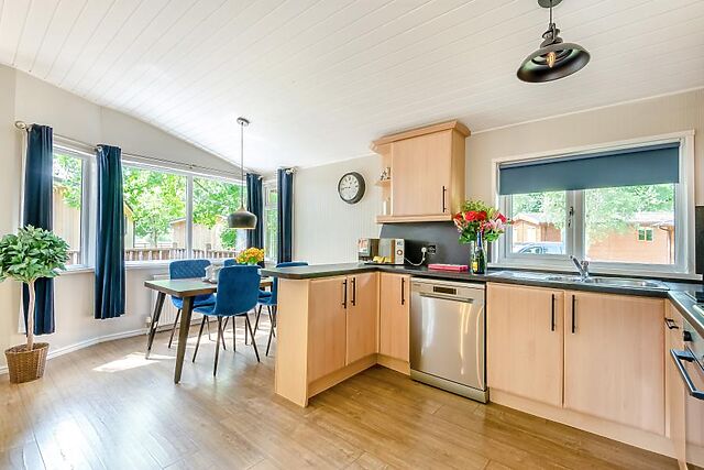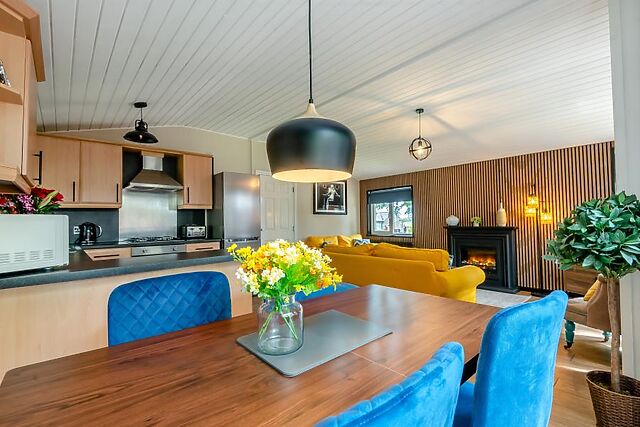 Inside, the lodge is welcoming and thoughtfully designed to encourage relaxation. The open-plan living area combines the living area with a TV, a dining space, and a fully functional adjoining kitchen, creating a sociable setting for cosy evenings in.