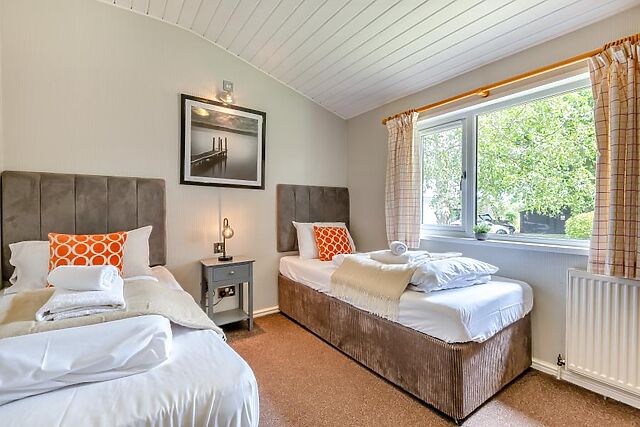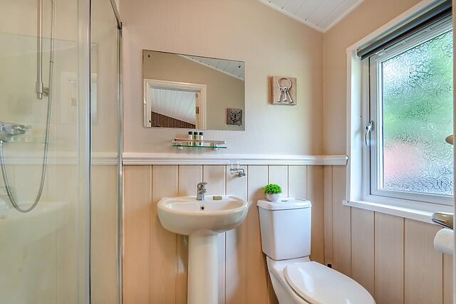 The double bedroom includes a TV and an en-suite shower room, ensuring a touch of privacy and convenience. The twin bedroom offers a comfortable space for additional guests, and the family bathroom boasts a bath with an overhead shower for added ease.