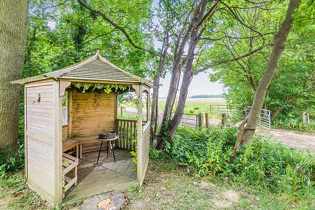 A private pagoda with cushioned seating provides a comfortable spot for outdoor dining or sunset watching. On-site amenities include access to a peaceful fishing lake and plentiful walks for exploring the surrounding area.