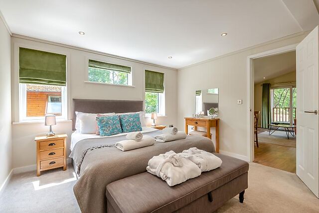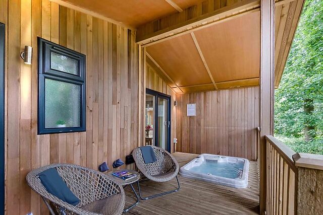 The lodge also boasts a spacious king-size bedroom complete with its own TV and an en-suite bathroom featuring both a bath and a separate shower. Outside, relax on the private deck with a covered hot tub, ideal for stargazing or simply unwinding after the day’s adventures.