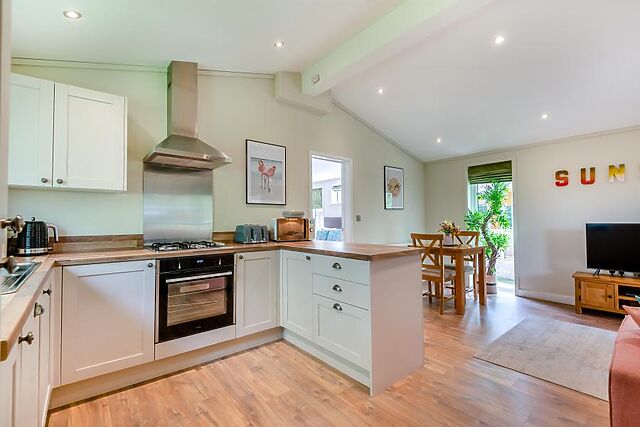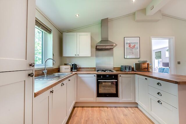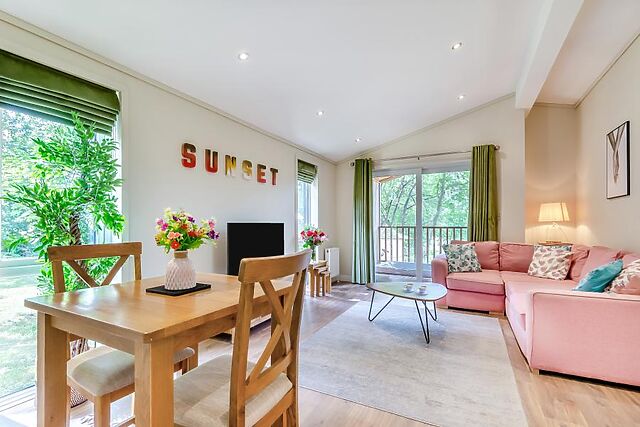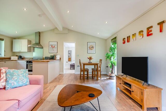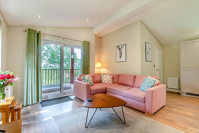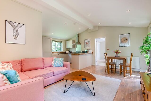 Step inside the lodge where you'll find a beautifully designed interior with a welcoming, open-plan lounge area that offers plenty of natural light and views of the countryside. The fully equipped kitchen and dining space for two make mealtimes a joy.
