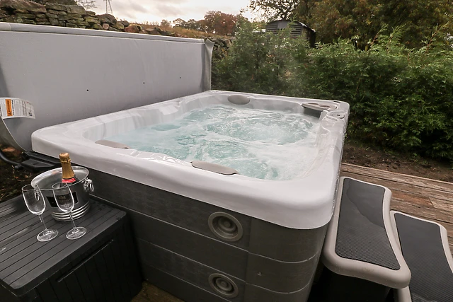 Step outside to discover your private patio, perfect for alfresco dining. The highlight, undoubtedly, is the elevated hot tub, where you can unwind under the stars, surrounded by the tranquil beauty of the countryside.