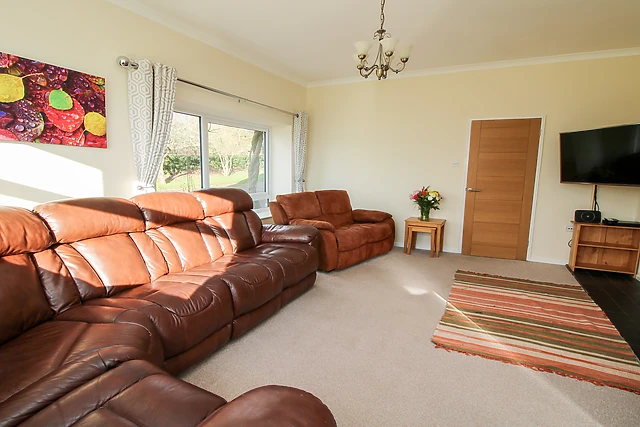 If seated dining is too formal, there is a separate TV room designed with viewing pleasure in mind with its outsized wall-mounted television and three seater recliner sofa. The sitting area is large enough for your full group, with two luxurious L-shaped sofas to sit around the woodburner fire and look out at the stunning views.