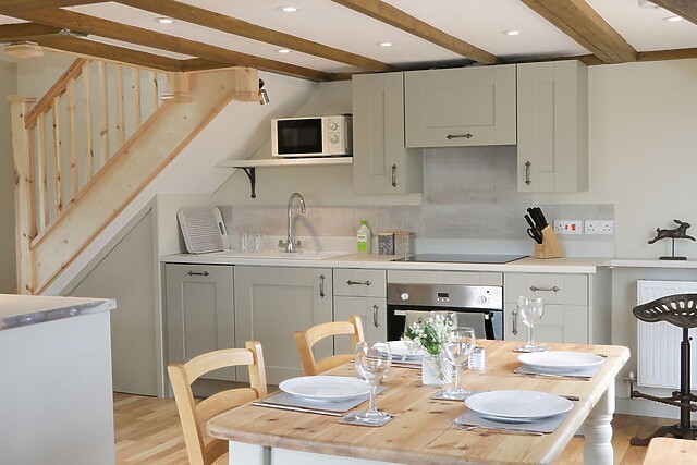 First, you will come to an open plan living, kitchen and dining area, ideal for preparing your favourite dinner time meals, before sitting back in the comfortable armchairs to enjoy the spectacular uninterrupted views of the Clun valley. A woodburning stove is tucked into the corner, and this room creates a soothing atmosphere for an afternoon reading session.