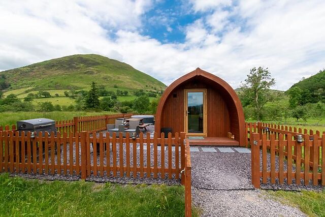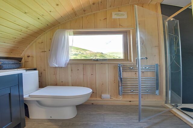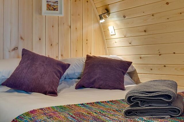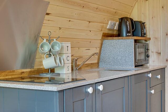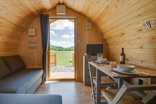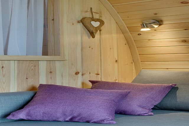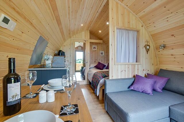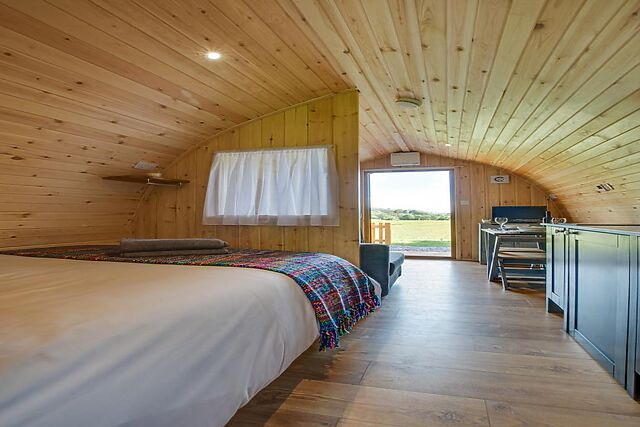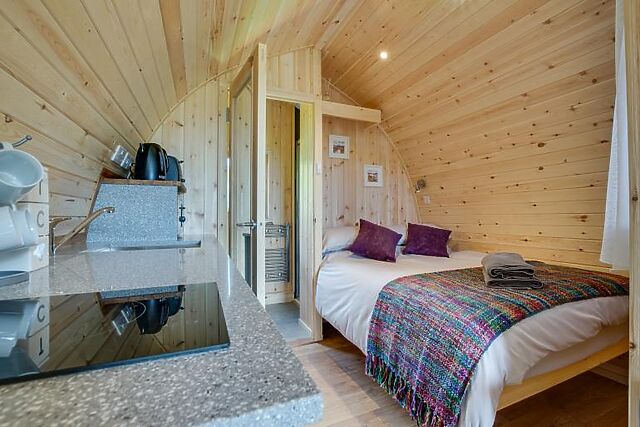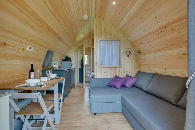 Inside, you'll find a comfortable living area with a corner sofa, TV, and DVD player, as well as a fully equipped kitchen. The double bed is tucked away next to the kitchen, and the modern bathroom is located at the far end of the pod. Underfloor heating ensures a warm and inviting atmosphere.
