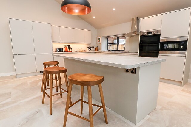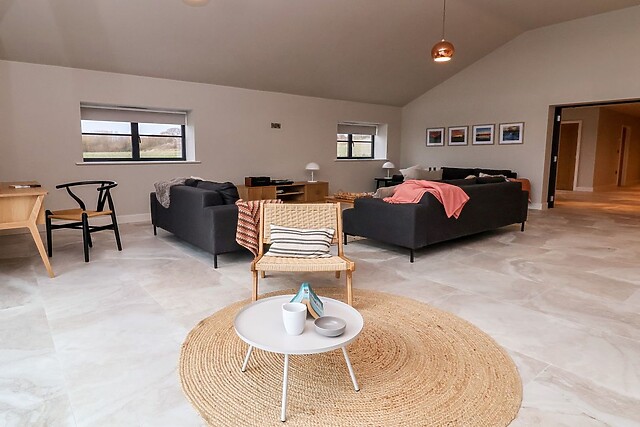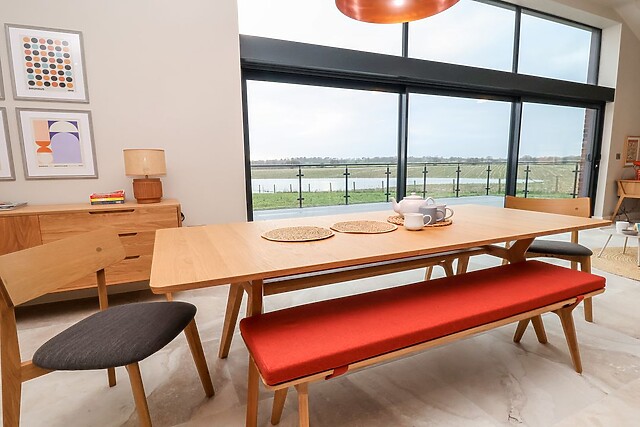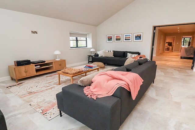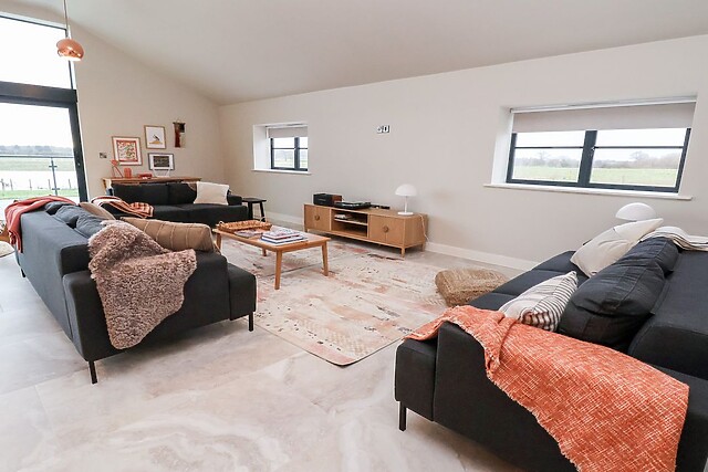 This opulent space houses a stylish sitting area where guests can put their feet up after a long day of exploring the local area, a contemporary kitchen with ample equipment, and a dining table, as well as access to a large utility. From here, dine alfresco in the rear, enclosed space, or take in the sunshine and stunning countryside views from the patio, overlooking your own private meadow and creating the perfect spot for a tipple in the sunshine.