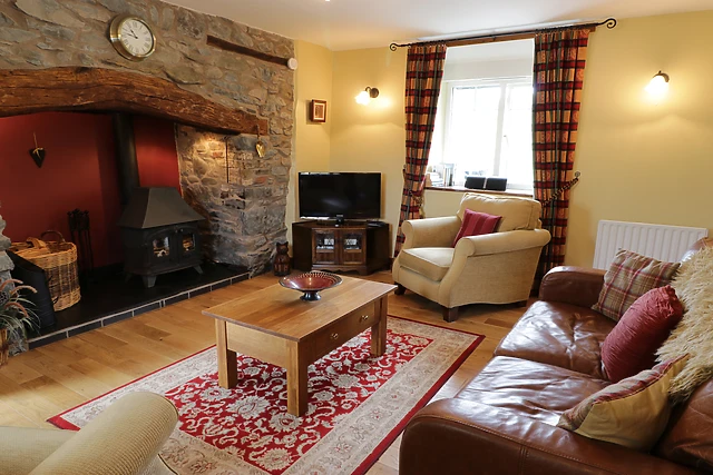 The welcoming sitting room is comfy with a wonderful stone inglenook fireplace housing a warming wood burning stove, perfect during those cooler months. A fully fitted country style kitchen is well-equipped and caters for all your needs, complete with dining table and chairs, ideal for a leisurely breakfast or late supper.